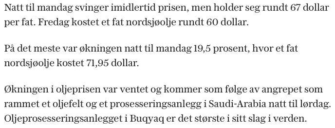 RobertX skrev: 15 sep 2019, 16:36 Blir spennende å se i morra hva som skjer om oljeprisen tar av som en rakett.