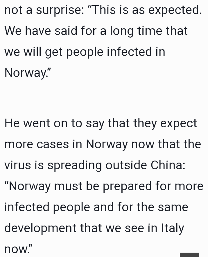 Arild Holtet skrev: 10 mar 2020, 02:32 Fremdeles så er det heldigvis ingen døde i Norge og beredskapen er høy. Skoler og idrett av alle typer stoppes elle går for tomme tribuner.