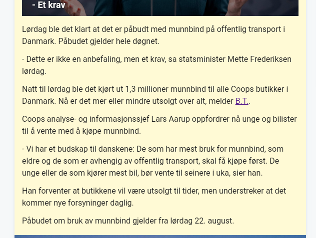 Munnbind har fkrnylig blitt annbefalt i Danmark også etter "ny lærdom" nå er det blitt krav om bruk på kollektivtrafikken døgnet rundt.