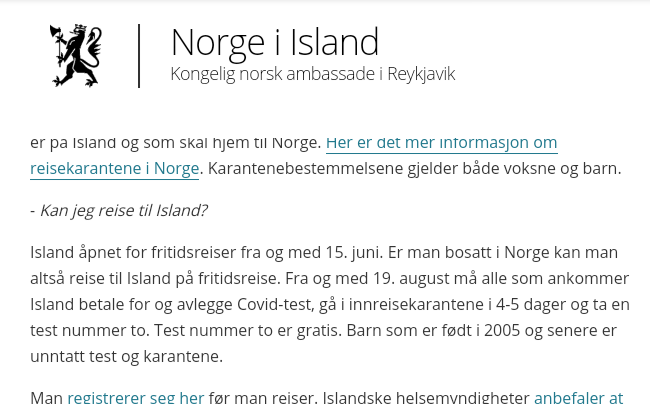 Nå blir det noen steder forlangt covidtest ikke eldre enn 72 timer gammel ved innreise. Tyskland ikke mere enn 48 timer. Forløpig mye forskjellig til og fra forskjellige land(se link) , Island skjerper igjen og der blir det 2 covidtester, en ved ankomst som ikke lenger blir gratis, så karantene til ny test noen dager senere.