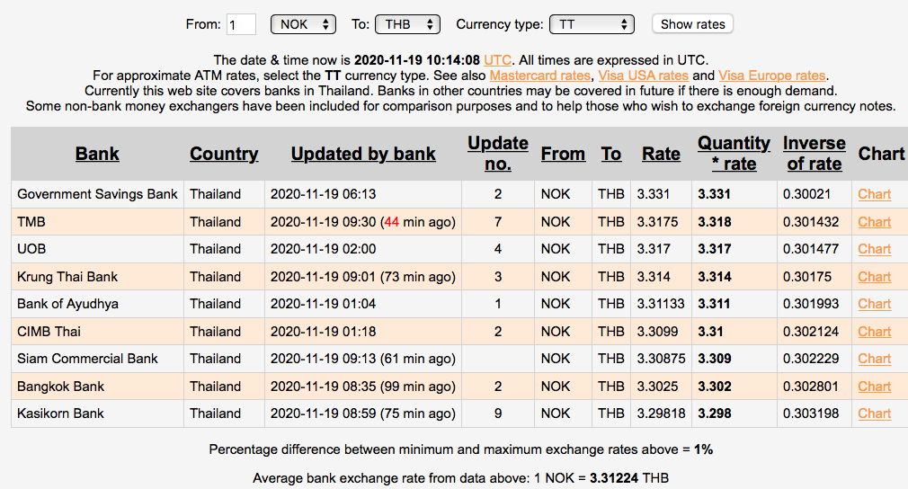 Da hadde Krung Thai Bank beste kurs på TT overføring, og Bank of Ayudhya hadde dårligste kurs.