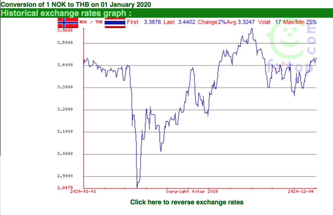 Det har vært ett turbulent år dette 2020, og covid-19 har rystet de fleste land kraftig. Her i Thailand har det vært litt roligere rennt sykdomsmessig, men krona den har svingt kraftig dette året. Grafen fra Norges Bank viser ett turbulent år, men grafen fra sist uke er ikke så ille. Men jeg har i minne da Bangkok Bank bare ga 2,60 baht for krona. Det er å håe at vi ikke ser en slik svak krone mer ved kjøp av thailandske baht.