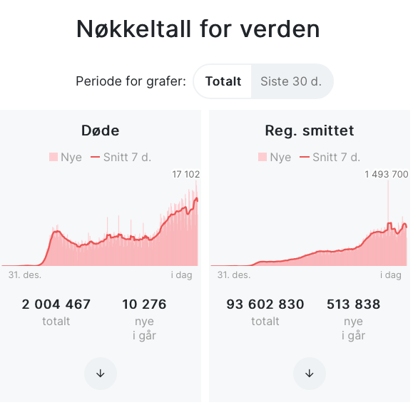 Stygge tall med døde av covid-19 denne morgenen. NÅ er det over 2 millioner døde på verdensbasis, og U.S.A. har 391.279 døde. Det verste er at det øker fremdeles, og når skal vi se slutten på dette. Vi har nå fått den værsts pandemien og døde side Spanish Flu 1957 til 1958.