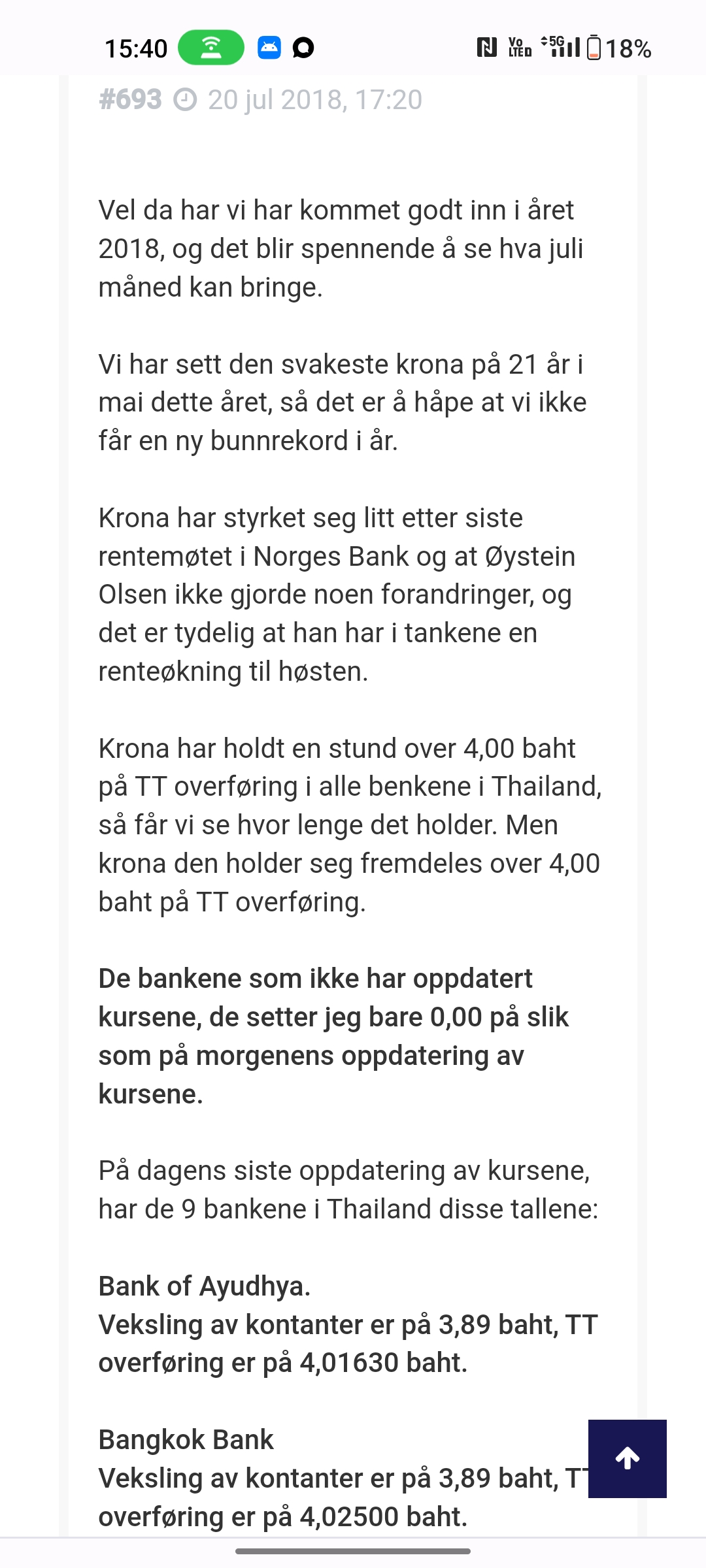 20 juli 2018 var krona over 4 baht, idag steg den til 3,38 på overføring igjen. Det er lyspunkter og forhåpentligvis går vi lysere tider i møte igjen. For thailand og folket er det to steg tilbake.
