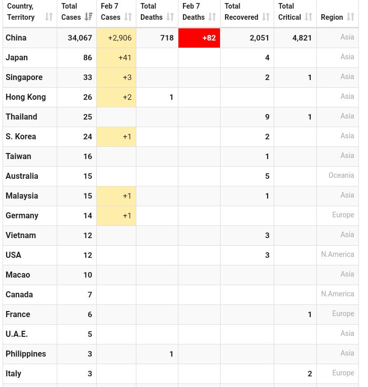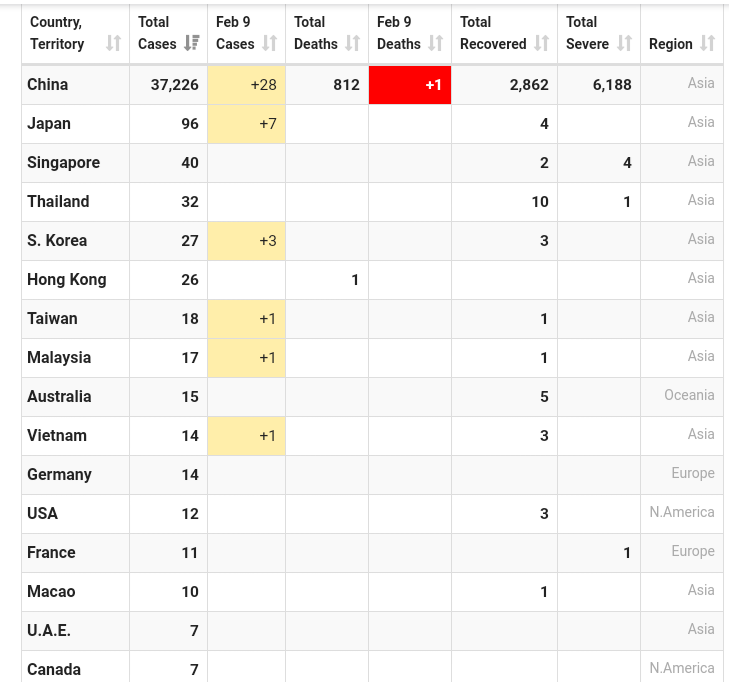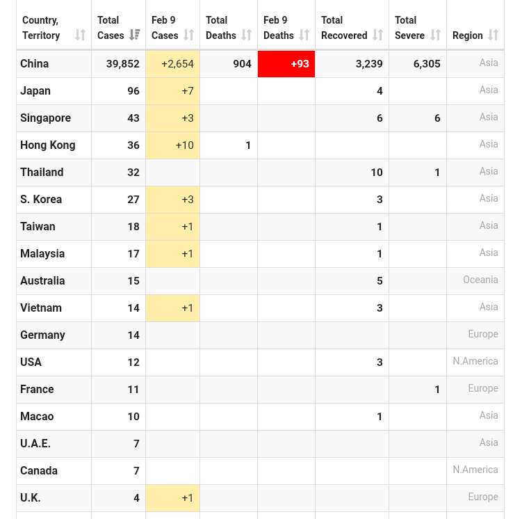 Flere land i Asia kommer nå langsomt opp på de første tall fra Kina , men Vietnam var vel først ute med å starte tiltak. Singapore har vel nå oppgradert til såkalt oransje fare uten at jeg vet hva det betyr, og Hong Kong har vel også innført karantene for folk fra Kina, utvikler det seg videre slik så blir det lite flytrafikk.Skulle en hatt den malen med døde ,alvorlig tilstand osv som i Kina ville det nå ha vært 4 og 5 døde hver dag, på statistikken utenfor og det er det heldigvis ikke, ikke har vi de 70 alvorlig tilfellene heller selv om det er en håndfull som sliter.