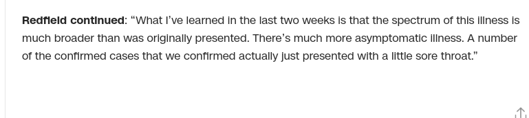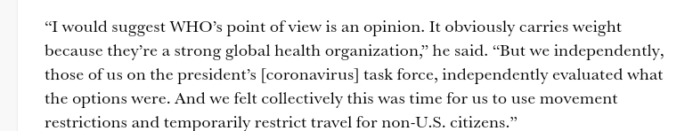 Kanskje vet fks, lederen for US smitteværn Robert Redfield at dette på sikt ikke nytter og derfor nå,forklarer om tiltakene som cil opphøre når smitten får spredtseg mere. Noe han også inrømmer er en stor mulighet til..Da ender de vel forsåvidt med fokus på hva Kineserene sier allerede nå , uten å bli hørt på.Da kan det være kjekt å være øverste ansvarlig i US for smitteværn og samtidig kunne være endel av noe en ikke har eneansvar for.