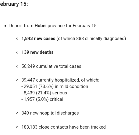 Går jo nedover med smittede også, men ut fra hvordan de tallene som er forløpig for denne dag blir det vel en opptur i morgen. Slikt er jo ikke uvanlig på influensakurver her til lands heller.Så ellers WHO sin mann fra stedet sier at her må,vi tenke globalt og at det kinesiske helsevesenet var bra. Men at det var en annen retorikk uten at han definerte noe mere om disse ting.Nå skal vel Amerikanerene hente ut ca 400 fra,det ene cruiseskipet og det verserer på noen nyhetsteder en mail som er sendt ut. Der fremgår det at hvis de ikke tar imot dette tilbud kan de risikere å bli der lenge Noen sier de ikke vil , nå kan de gå,fra karantene om 3 dager og vil ikke i en ny 14,dagers i US. Så utviklingen fra de som fatter vedtak bør nok følges. Noen medier fremstiller fks Th som hub da de vistnok ikke gjør nok, men regner med at det ikke flyter,så mange lik rundt i gatene.Da hadde jeg sikkert lest det her.Den Amerikanske smittevernlederen har ellers blitt sitert nå om at vi kanskje får dette som en ny sesongmessig influensa.Da synes jeg de bør begynne å kikke litt mere,på tall også. Fks,dødligheten i områdene ellers i Kina. Som jo ligger på,raporten til WHO ,Kanskje kikke på slike tall som som den gruppen som tross,alt er mest utsatt for smitte også . De må,jo være,veldig utsatt gruppen av sykepleiere fks. 1750 smittede,så langt og 6 døde etter så lang tid eksponert i et sikkert veldig virusfylt arbeidsmiljø..Så jeg ser ikke vekk ifra mange teorier fremover for å,deeskalere dødstrusselen som jo noen har fremført.