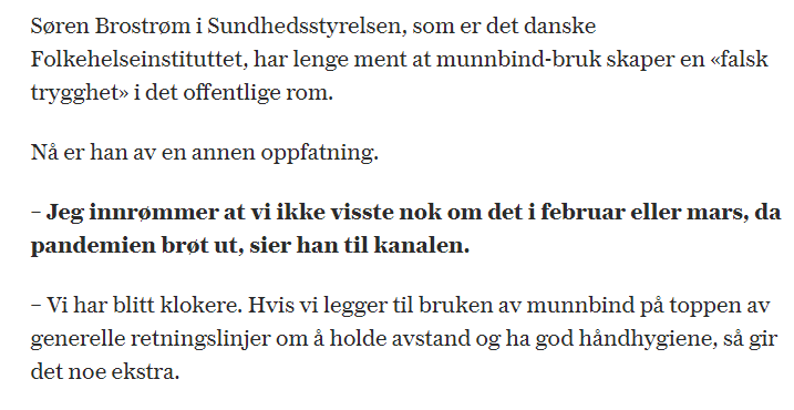 De begrunner de endrede syn om masker med at de har "blitt klokere"når de nå ikke har noen egenerfaring å studere på. Kan en kanskje undres på om det har vært manglende vilje til å lytte på andre fks WHO.?.En får se hva FHI sier i morgen.og hvordan de begrunner.