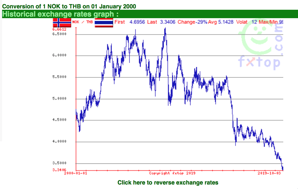 Grafen fra Norges Bank viser ganske klart, at krona den har falt jevn og sikkert noen år. Så det å få 1års Visa når man er ugift med en minstepensjon går ikke, for minstepensjonen er godt under 65.000,- baht. Men er man gift så har man mer enn nok for det som krever 40.000,- baht i måneden