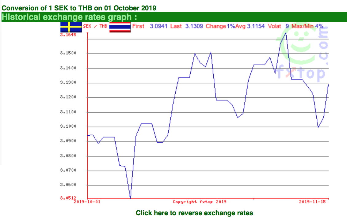Da har vi kommet godt over halve året, og er inne i det siste kvartelet året 2019. Krona den går både opp og ned mot baht for tiden. Som vanlig. Men tross alt så holder krona seg ganske stabil mot baht, selv om den ikke er så sterk som før……….