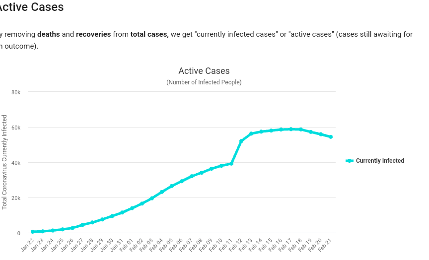 Også det samlede antal smittede (aktive saker)minker nå. Det er mange tolkninger ute å går om WHO sine ord om vinduet Kina gav verden.