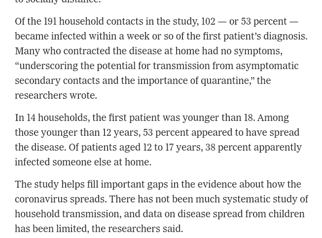 Leste en 1 mnd gammel artikkel fra US hvor de også nå har funnet ut at det tar ca 1 uke innen hele hustanden er smittet, dette uansett om smitten kommer inn i huset med et barn eller voksen først. Så mulig det er en god ide som Asiaterene gjør , stenger skoler og isolerer de smittede.