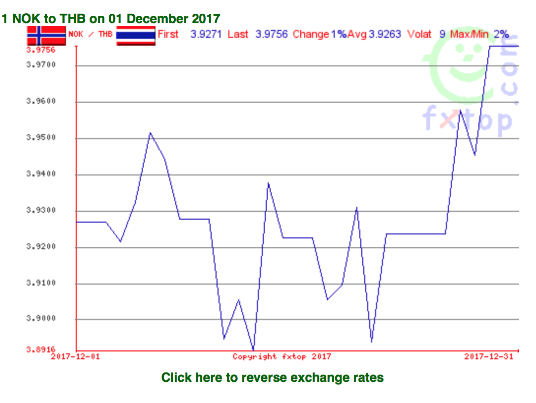 Da har vi kommet over halve januar måned i 2018, og krona har vært bedre enn i hele desember 2017. Grafene viser helt klart sitt, og gjennomsnitt for desember var 3,926293 baht i Norges bank. Frem til nå så har gjennomsnittet vært 4,015660 baht, så det blir så spennende å se resten av januar, og ikke minst hva dette året blir for krona ved kjøp av baht.