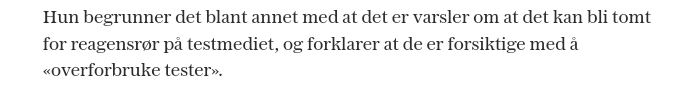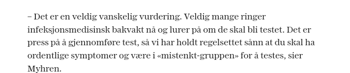 Men om det skal sees på beredskap så kan en undres, ingen nasjonal oversikt over folk i hjemmekarantene, sitter fks 50 i Mo i rana og skal vente noen dager før de kan få svar på prøver pga. logistik, samt resurser på sykehussektor til å få tatt, gjort prøver.