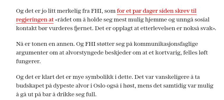 Jeg er nok enig i mye av dette i VG i går, om at det velges og vrakes av tiltak. Med 2 aktører FHI og Helsedirktoratet som ikke har felles,syn på tiltak så velges kanskje de tiltak hvor lista ligger lavest fra begge parter.