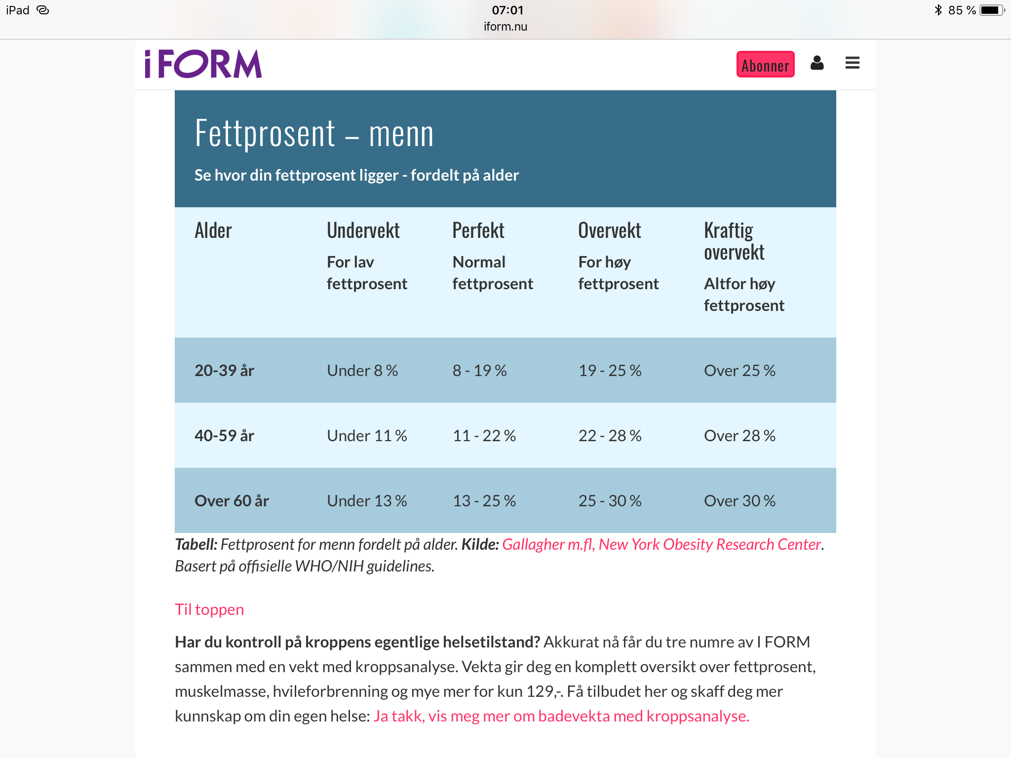 Her er tabellen for ideal fettprosent for de som finner det intressant.