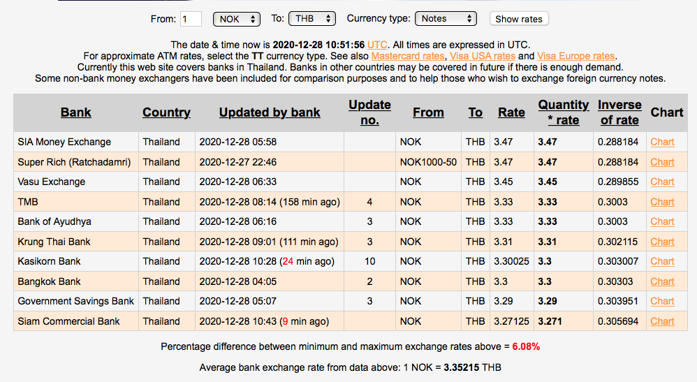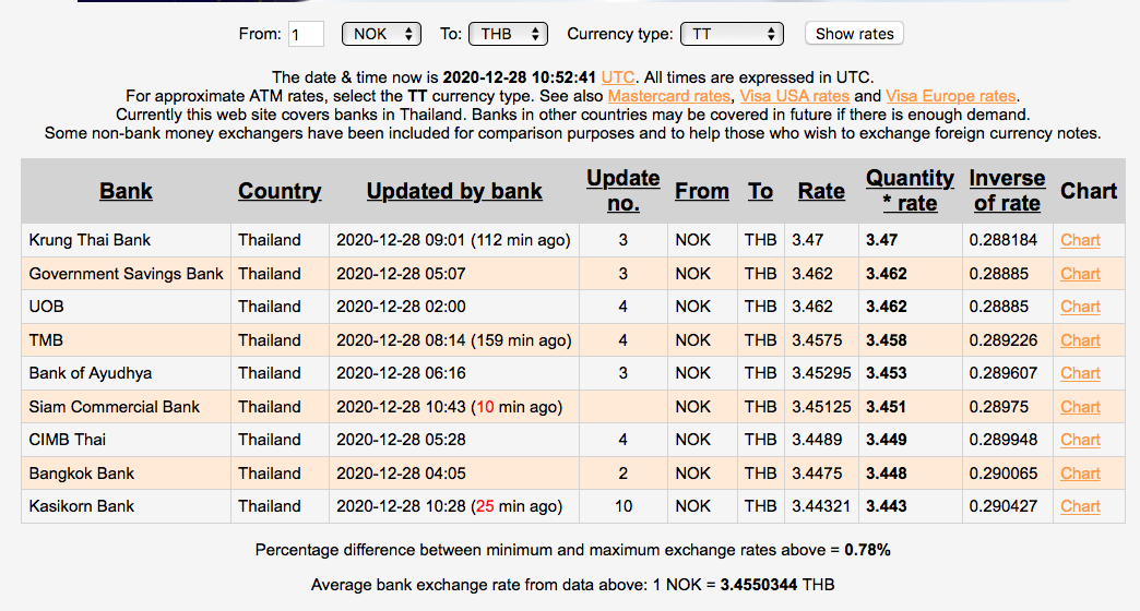 Da hadde Krung Thai Bank og UOB Bank beste kurs på TT overføring. Bangkok Bank hadde den dårligste kursen, og alle kursene er i skrivende stund.......