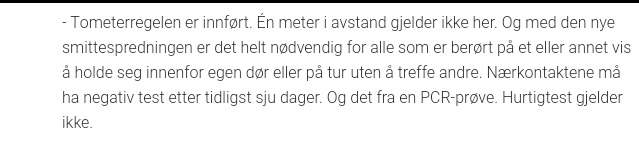 I Follo vurderte en at nærkontaktenes samboere også skulle i karantene. Noe vistnok noen innlandskomuner erfarte allerede på våren med det vanlige viruset
