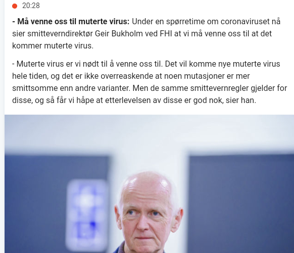 Bukholm i FHI mener vi må venne oss til,disse smittsomme virusene, men jeg skulle nå ønske det var vi som la premissene og ikke viruset.