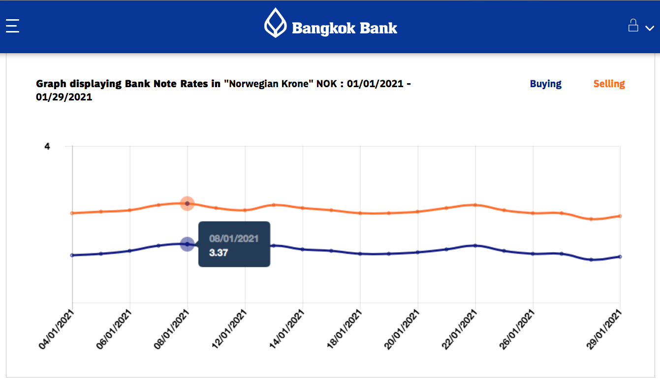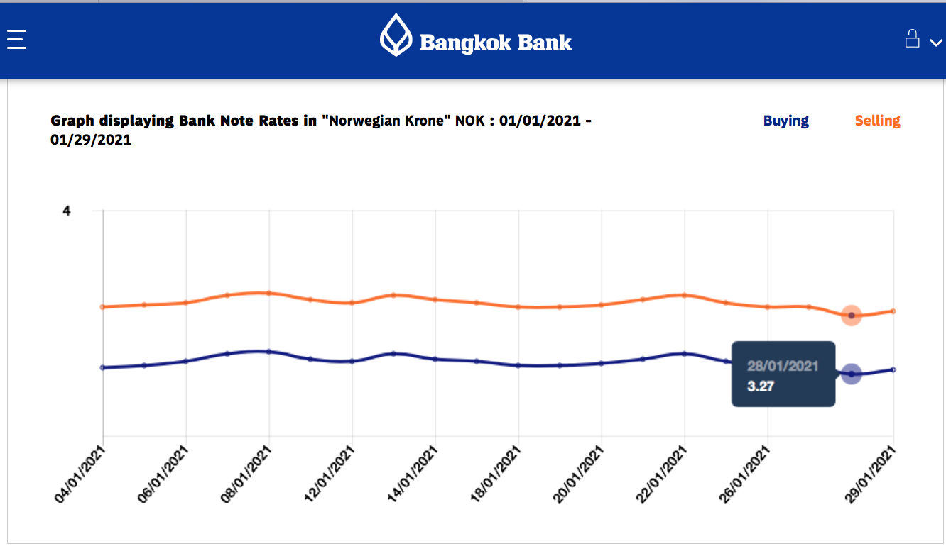 I dag er det siste dagen i januar, og vi kan ta ett tilbakeblikk med grafer. En fra Norges Bank som viser hva Norges Bank fikk ved kjøp av baht på TT overføring. Litt bedre enn det var i 2020, og laveste kurs var på 3,4518 og høyeste kurs på 3,5822. Vi får nok ikke samme kursene i bankene i Thailand, for her er det opp til hver bank hva de vil gi i kurs for krona.