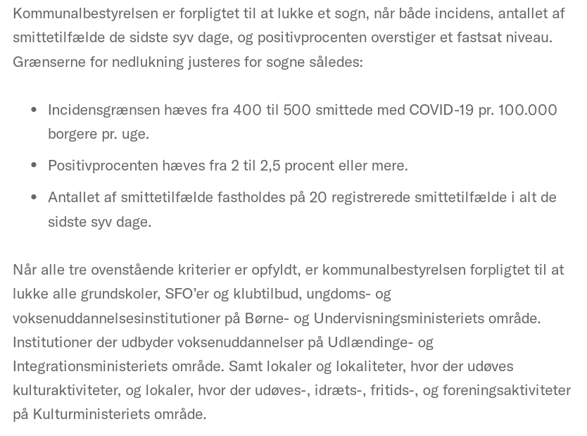 I DK som det ofte henvises til er det riktignok høye grenser for å lukke ned fylker og landsdeler nå. Men til gjenfjeld for å ha det er grensen for å lukke ned i mindre målestokk innført. Det er som her mulighet til komuner, men også ned til nivå som sogn. Helt ned til kirkesogn selv i byer.