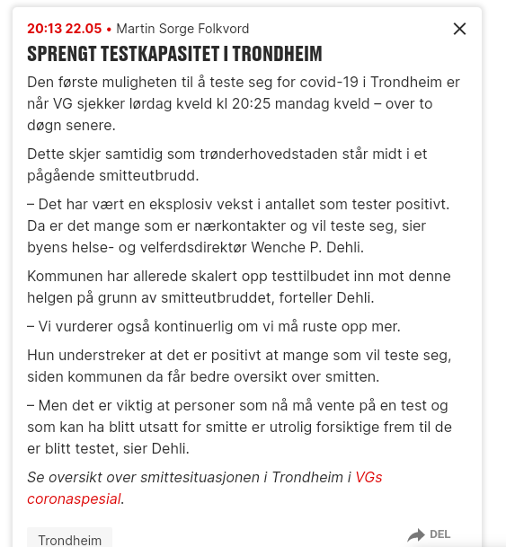 Jeg så en pressekonferanse i forbindelse med utbruddet i Hammerfest, Ordføreren fortalte at de hadde det komunale 5 % målet men hadde vært nødt til å kalle inn til det dobble for å,kunne holde tritt.Vi har jevnt og trutt oppskalert testing men åpenbart ikke kapasitet
