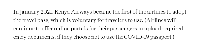 Nå har vi kommet langt med vaksinering men særlig smittebevisthet har vi kanskje ikke, lekte med pilene og fant ut at vi ville vært på 7 plass blandt de afrikanske land med mest smitte. Kikket litt mere på tiltak der. Og blir imponert over flere ting. Hørte litt for en stund siden på en pressekonferanse fra WHO om fks flyselskapene som har gått fått foran med biometriske vaksinepass noen steder, og det øker i omfang Så googla litt.