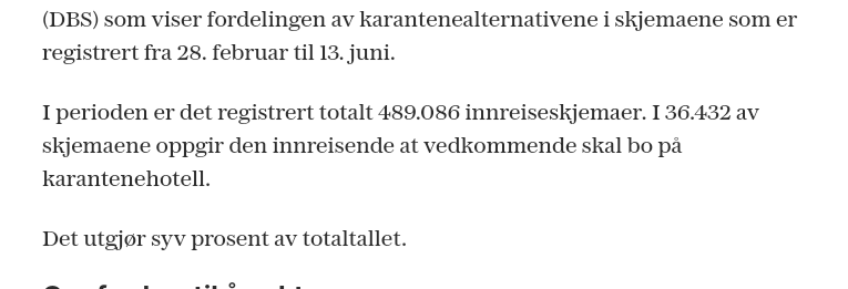 Nå så jeg eller et stykke hvor det kom frem at etter fritak, unntak, og andre arangementer, kun var 7% som har vært i hotelkarantene. Dette til tross for at vi vistnok har som de sier"verdens strengeste innreiseregime :D "