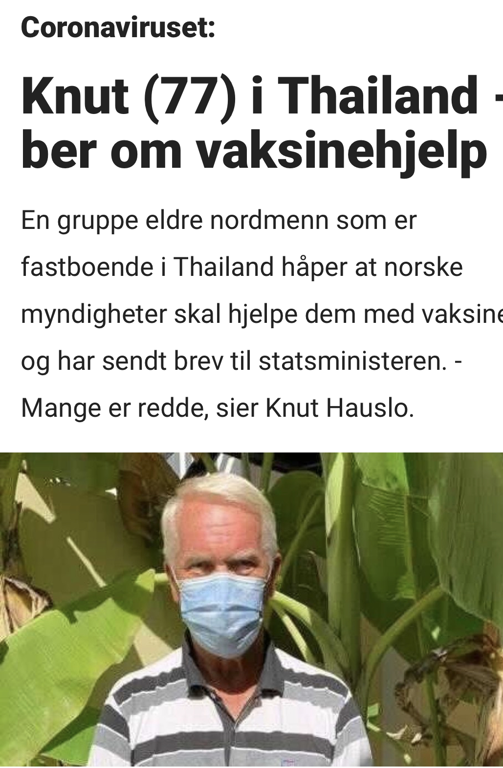 Og da forvente at Norske myndigheter stiller opp? Vel det er kanskje litt mye å be om å få de til å sende RNA vaksiner til Thailand, eller kjøpe seg foran køen til alle andre som venter på RNA vaksiner her i Thailand?Vi er klar over at det angivelig tilbys vaksiner til utlendinger her i Thailand, men det er i så fall AstraZeneca, eller den kinesiske vaksinen - og verken min kone eller jeg er interessert i noen av dem. Samtidig vet vi at det er mange andre fastboende utlendinger her som har forsøkt å få de vaksinene thailandske myndigheter tilbyr, men vi kjenner svært få som har lykkes med det, svarer Hauslo.
