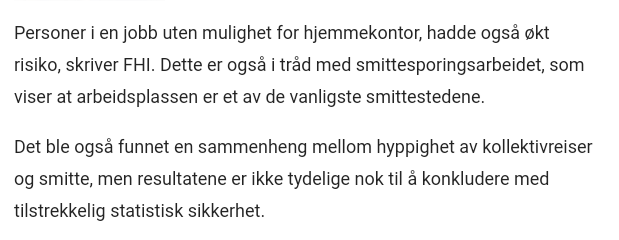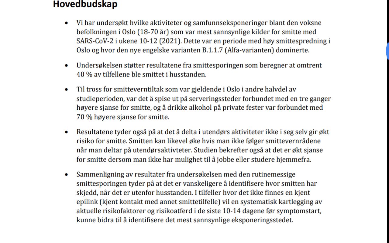 Har de måtte undrsøke at det er mindre risiko for smitte ved å sitte på et hjemmekomtor vs gå på arbeide med andre mennesker. Jeg trodde vi var såpass opplyste. Men litt å lære alikevel om en ikke viste og kun vil forholde,seg til Norske undersøkelser samt ha tvil til Internasjonal erfaring fra epedemier og undersøkelser..Samtidig må en ta hensyn til at det var mye stengt i byen mens de underøkte. Ca 1000 med . Fjern 40 % hjemmesmitte . 20 % på andre steder.