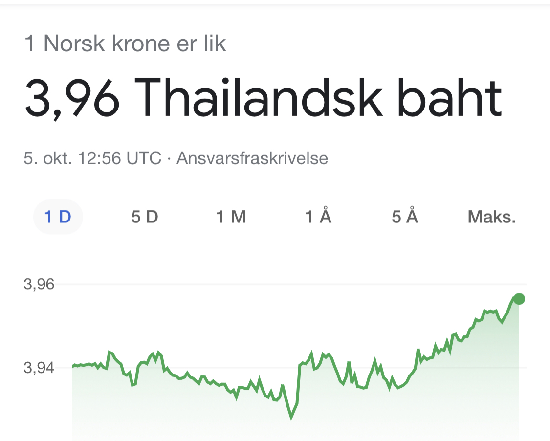 Det er nok ikke noe unormalt på gang, for når Norge har hevet styringsrenten og ekstremt høy inntekt på olje og gass, så er det helt normalt at krona styrker seg. Turismen som er elendig i Thailand gjør jo og at Thailand sin inntekt svekkes ganske kraftig. Så det blir spennende å se resten av dette året, og hva krona står i ved neste heving av styringsrenta dette året.