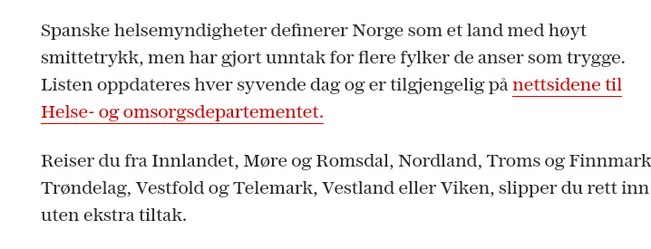 Selv med kun 47, 6 smittetillfeller pr 100 000 er vi høyrisikoland for Spania.. Blir ikke lett å planlegge reise om det skal bli lokale utbrudd og en plutselig er i såkalt rød sone.Eller om en tror alt er ok så er det nå noen land som tester før du får reise ut. Kan bli litt lesestoff over forargede Nordmenn i sommer.