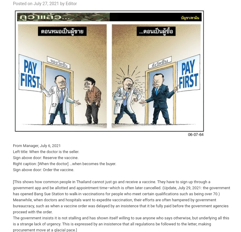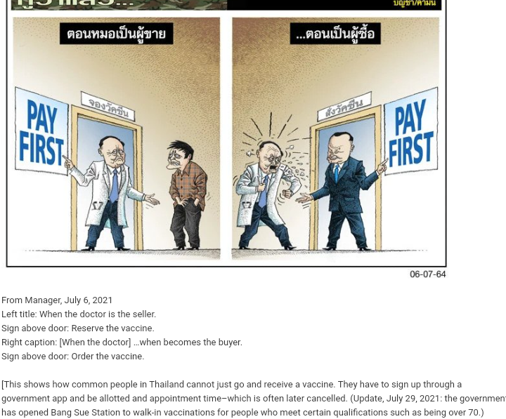Fortelles også om Thaiere som til tross for å ha refitrert seg på app til vaksiner har fått kanselert avtaler. Men dog uten at det skrives om årsaker.