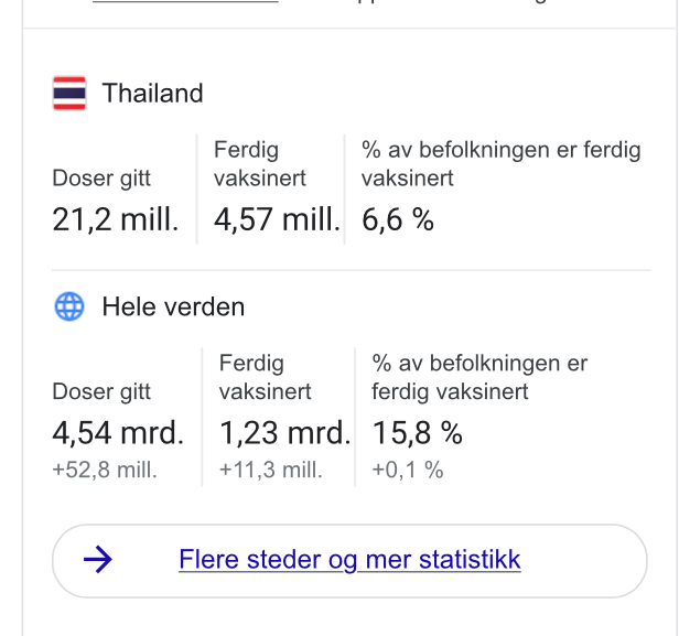 SomLao skrev: 11 aug 2021, 19:02 Jeg hadde håpet på at det så lysere ut nå ut i august enn det vitterlig gjør. Å dra til Thailand neste sommer, er jeg stygt redd vi kan se langt etter.