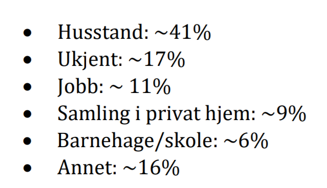 Tidligere kom det frem at 41%var smitte i familie og 11 prosent på jobb. Så 52%på enkle steder å finne smitte.og i tillegg,17 prosent med ukjent smittevei i Oslo
