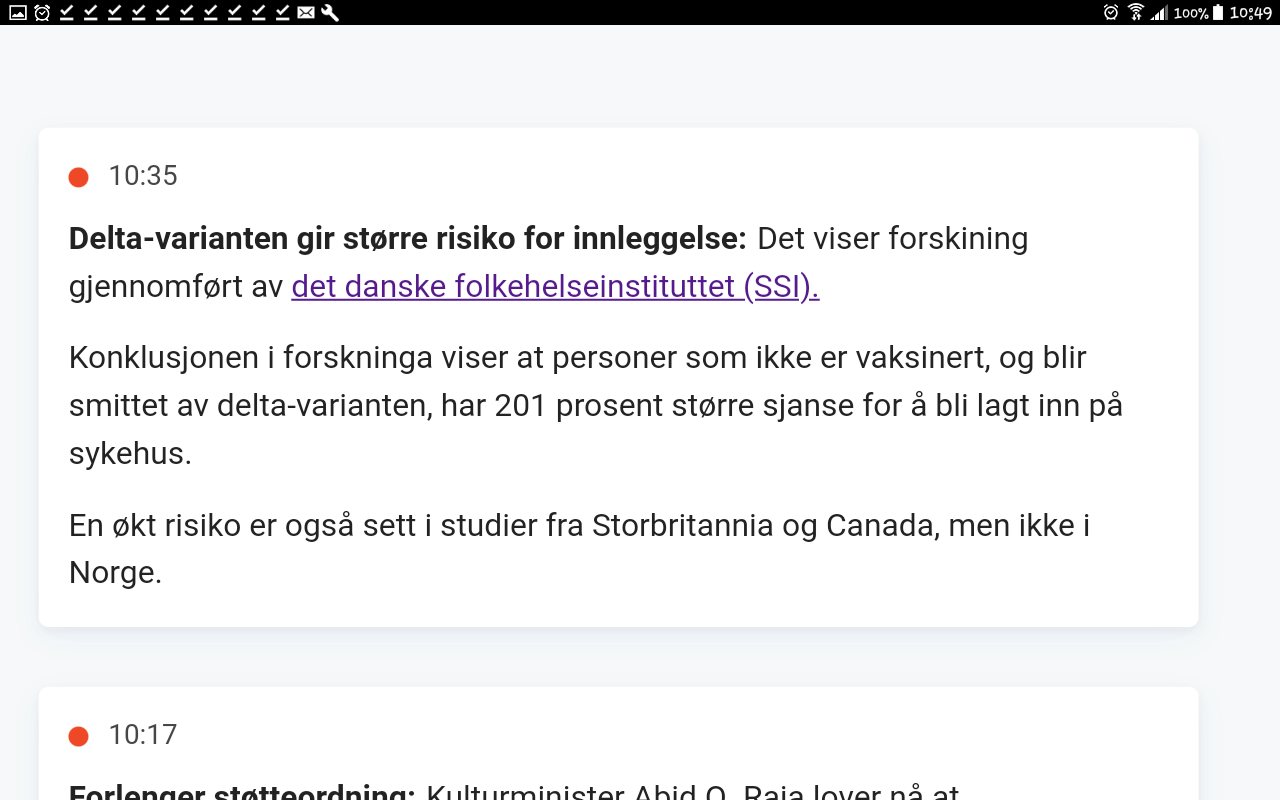 https://direkte.vg.no/nyhetsdognet/news ... =share-btnUndersøkelser av coronavaksinenes effektivitet viser at den synker over tid, og at en påfyllingsdose kan være nyttig etter noen måneder.