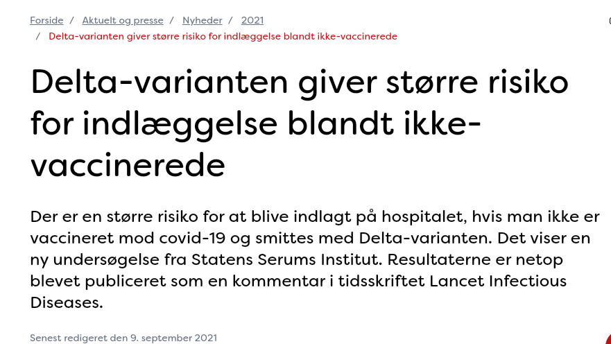 La for litt siden ut en undersøkelse fra Lancet om at Delta førte til større sykehusinnleggelser. Nå har det Danske seruminsituttet kommet til det samme, og lagt ut sine konklusjoner som en komentar også.