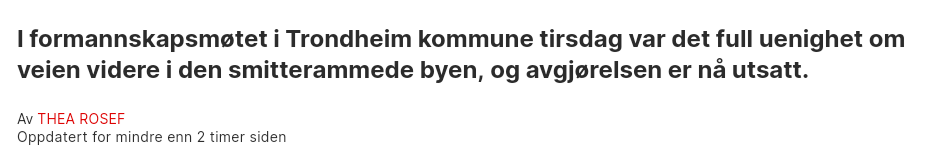 Throndheim hadde i dag 212 nye smittet, det ble allerede før helgen opplyst at de ikke lengere hadde kapasitet til smittesporingen. En kan kanskje da ikke si de har helt kontroll på smitten, når de samtidig fortalte om hvordan smittetallene også nå økte i nabokomunene.