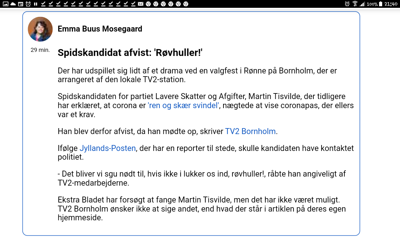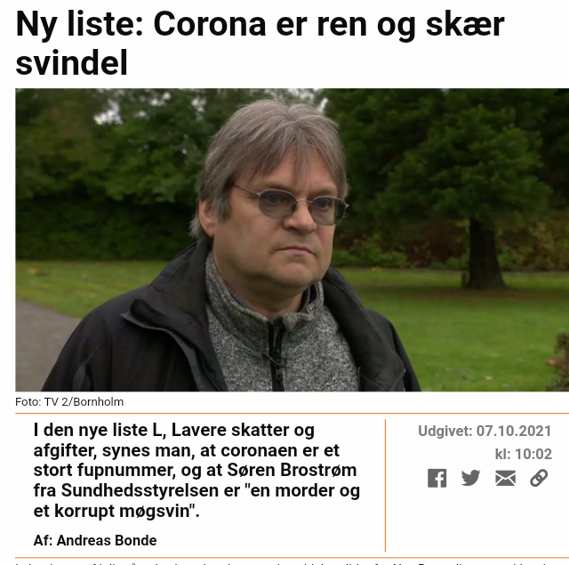 Den politiske yttringsfrihet om corrona er stor i Danmark.Og språkbruken er muligens også litt over grensa for Norske politikere. Ser ikke vekk ifra at her var vedkommende slaktet av pressen og muligens fått passet påskrevet fremfor å få yttre seg.Men om det er klok valgkampsak/holdning som stemmesanker av kandidaten vet jeg ikke Selv om selve mannen bak postingen på FB trakk seg så har han sin støtte..