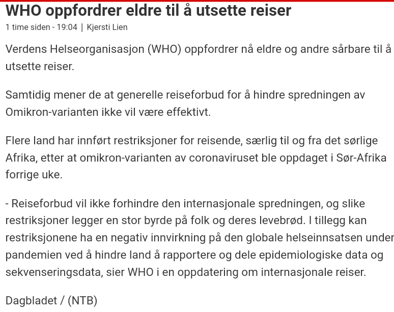 Dagbladet melder at WHO har oppdatert sine reiseråd. Da med advarsel til de sårbare. Som sedvanlig intet om noe som ikke er i Norsk smittevern