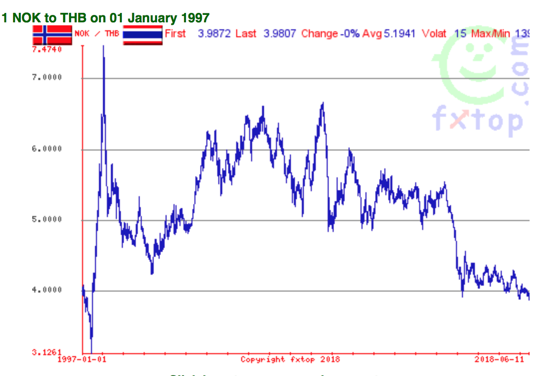Jeg var så klar over at vi hadde sett toppen for norsk krone, noe jeg også skrev i Asiaforum i 2010 og sa at krona ville raskt havne på 4,5 baht og lavere. Jeg tok vare på den gode tia da krona var sterk, og fikk en bra rente når jeg låste pengene på sparekonto i Bangkok Bank.