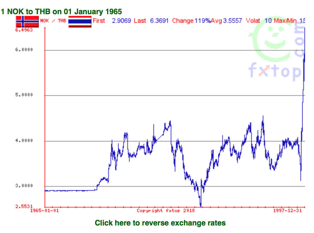 Det var nok å ta i litt vel mye, for krona var svakere i 1997 og for 21 år siden. I 1965 så sto krona i 2,55 baht, og dit håper jeg ikke vi kommer.