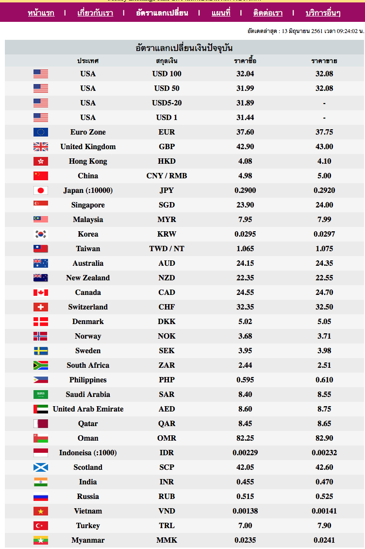 Veksling av kontanter er på 4,80 baht, TT overføring er på 3,96750 baht.