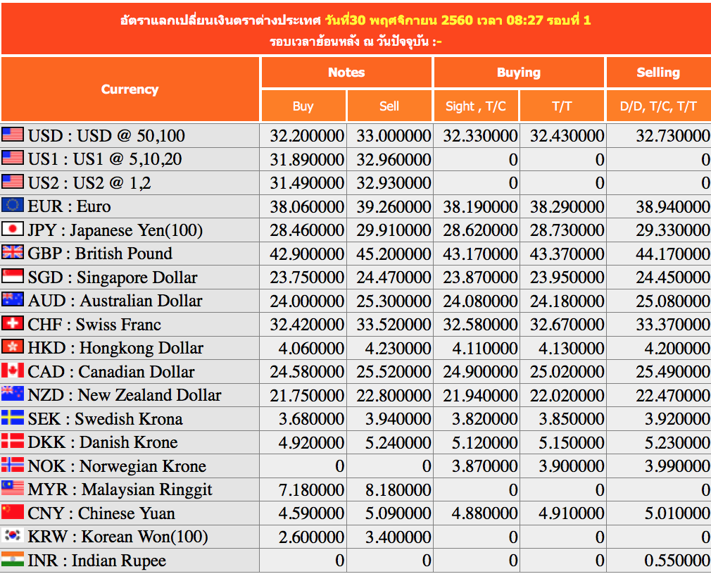 På dagens første oppdatering av kursene, har de 9 bankene i Thailand disse tallene: