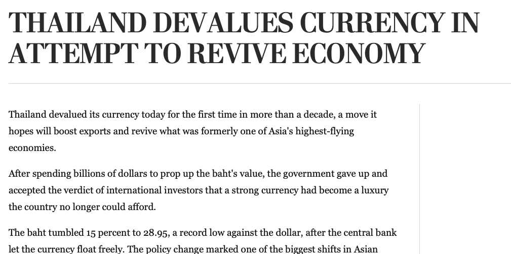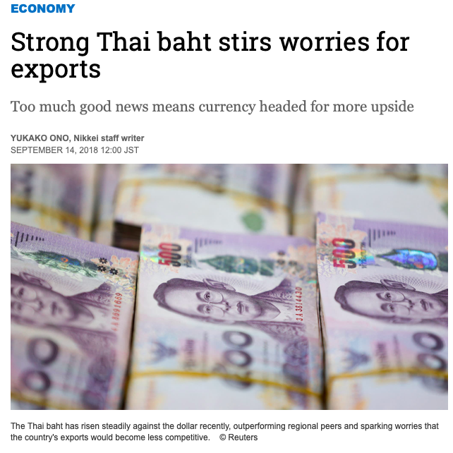 Den generelle tanken rundt et lands valuta, spesielt for eksport-orienterte land, er å holde valutaen svak. Og Thailand er jo fokusert på eksport og turisme. Så logisk sett burde Thailand ønske å holde valutaen sin svak eller på linje med sine konkurrenter i Asia. Men det er ikke det som skjer nå.