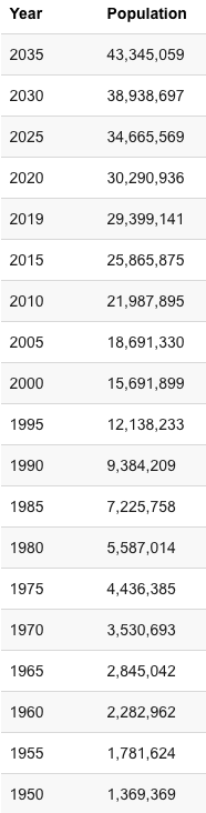 Dehli har i dag over 29 millioner mennesker og også blant verdens høyeste befolkningstettheter. Det er antatt at Dehli vil øke til 38 millioner med dagens vekst frem til 2030.